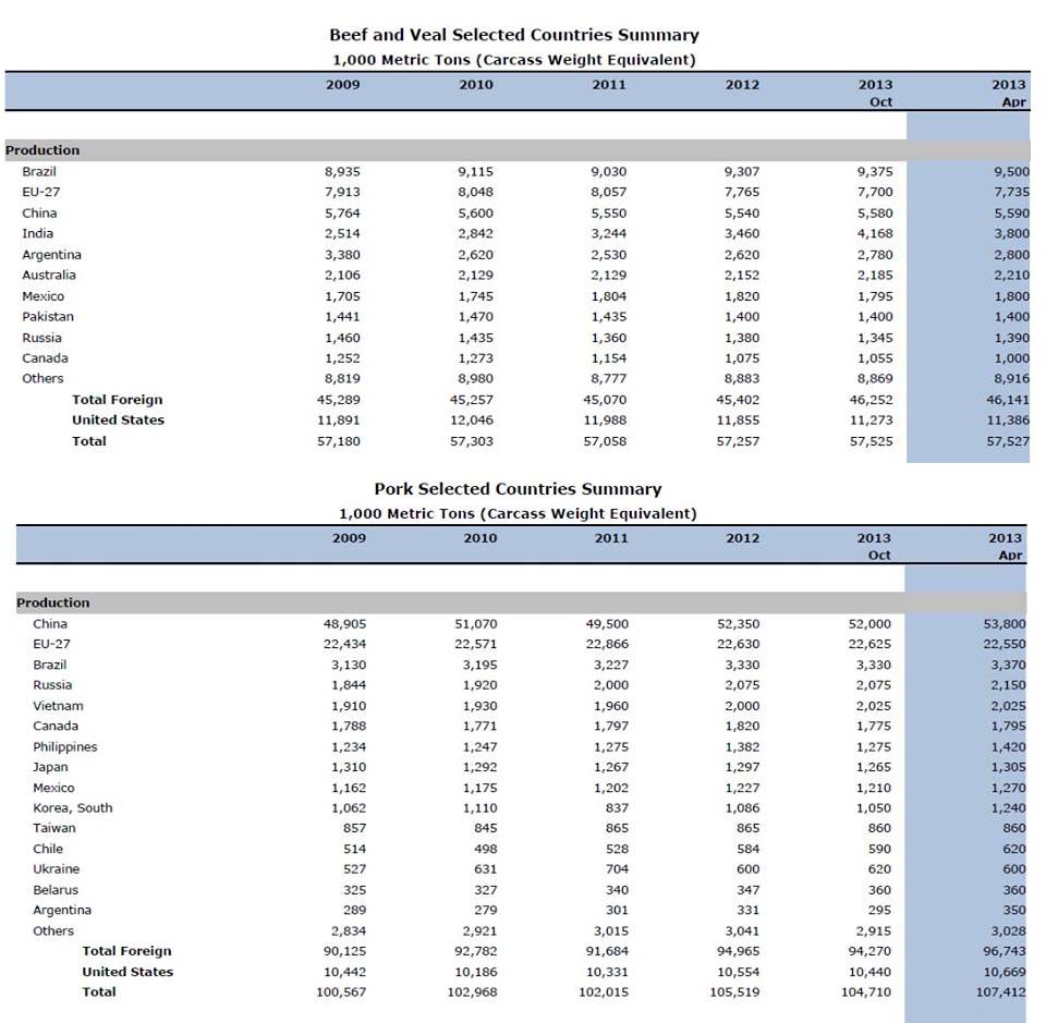 ၂၀၀၉ ခုနစ္မွ၂၀၁၃ (ဧၿပီလအထိ) အေမရိကန္နုိင္ငံ စုိက္ပ်ဳိးေရးဌာန (United States Department of Agriculture) ကထုတ္တဲ႔ ကမၻာ႔ သားငါးထုတ္လုပ္မူ႕ မွတ္တမ္းတြင္ http://www.fas.usda.gov/psdonline/circulars/livestock_poultry.pdf
